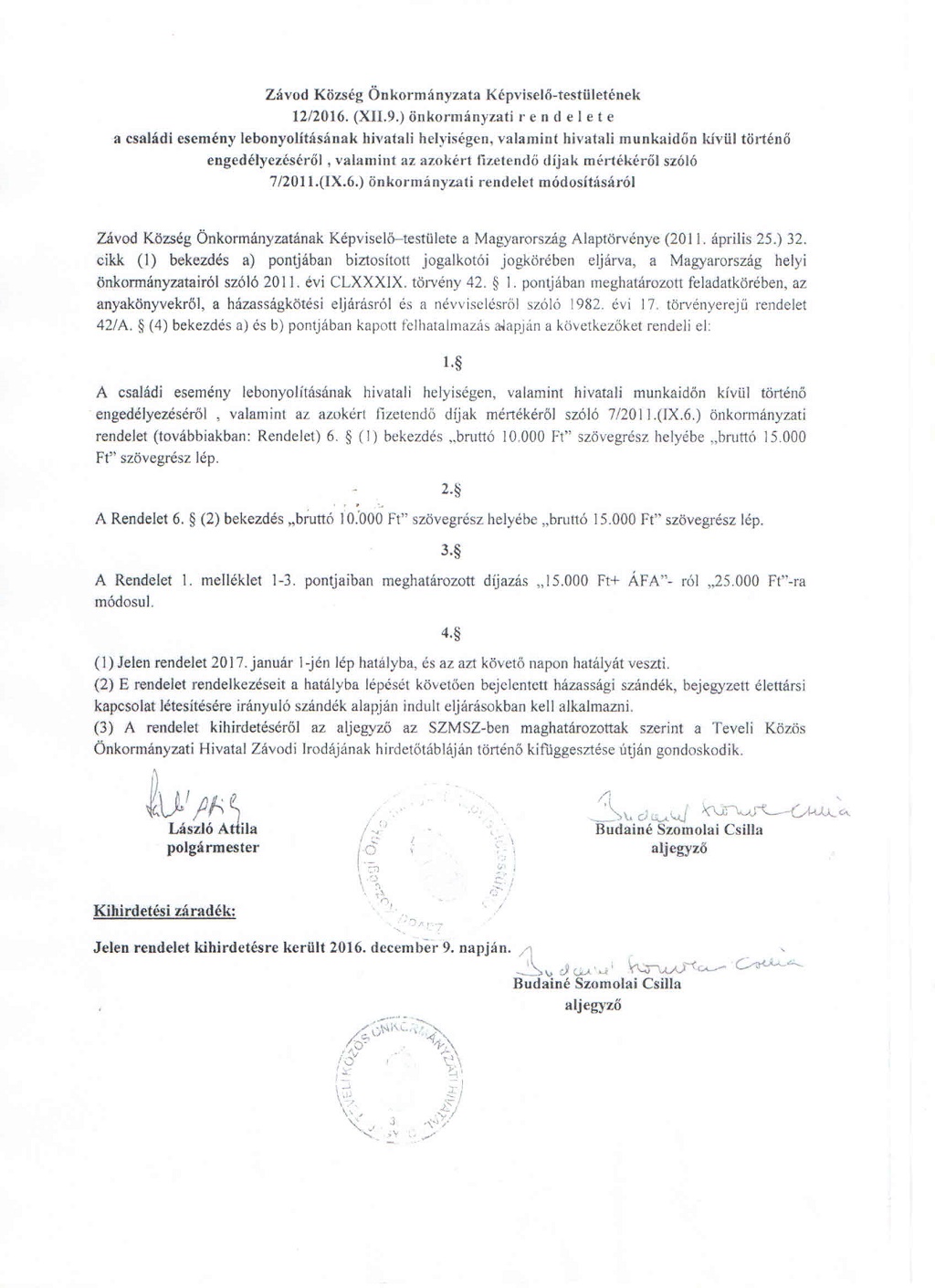 12/2016.(XII.9.) Rendelet a családi esemény lebonyolításának hivatali helyiségen, valamint hivatali munkaidőn kívül történő engedélyezéséről, valamint az azokért fizetendő díjak mértékéről szóló 7/2011.(IX.6.) önkormányzati rendelet módosításáról